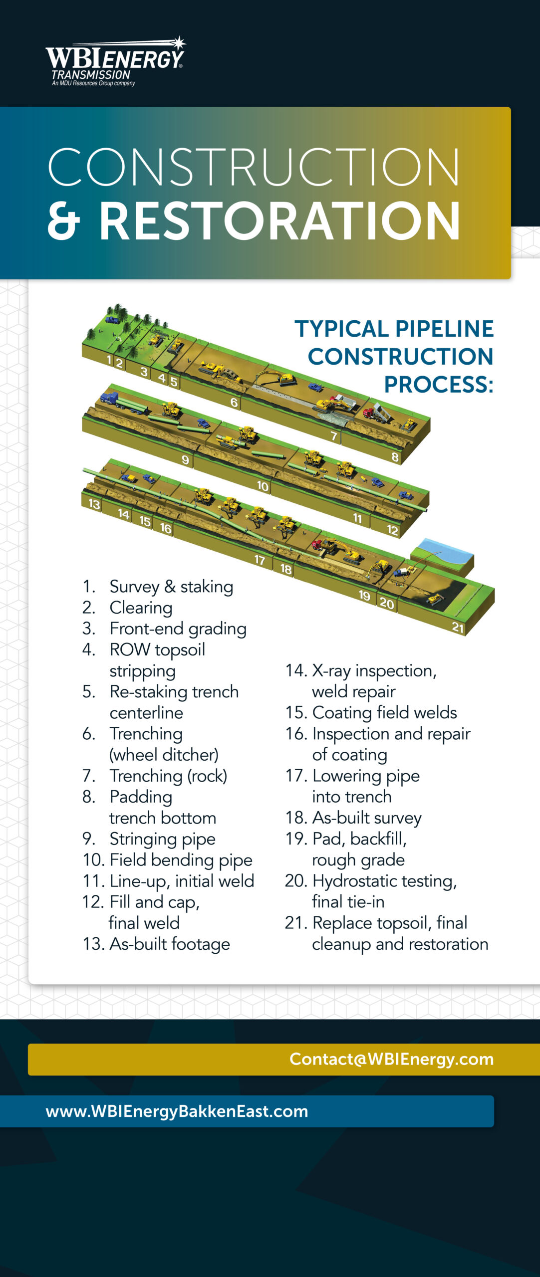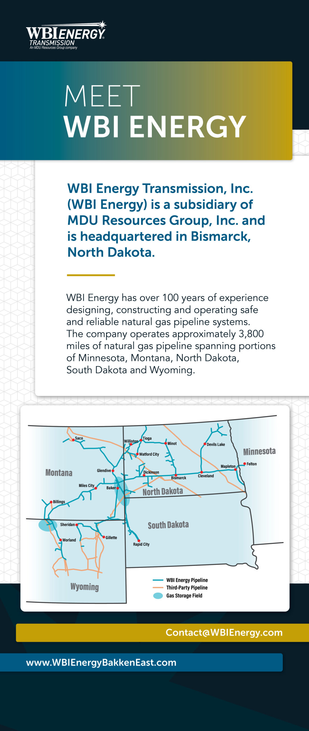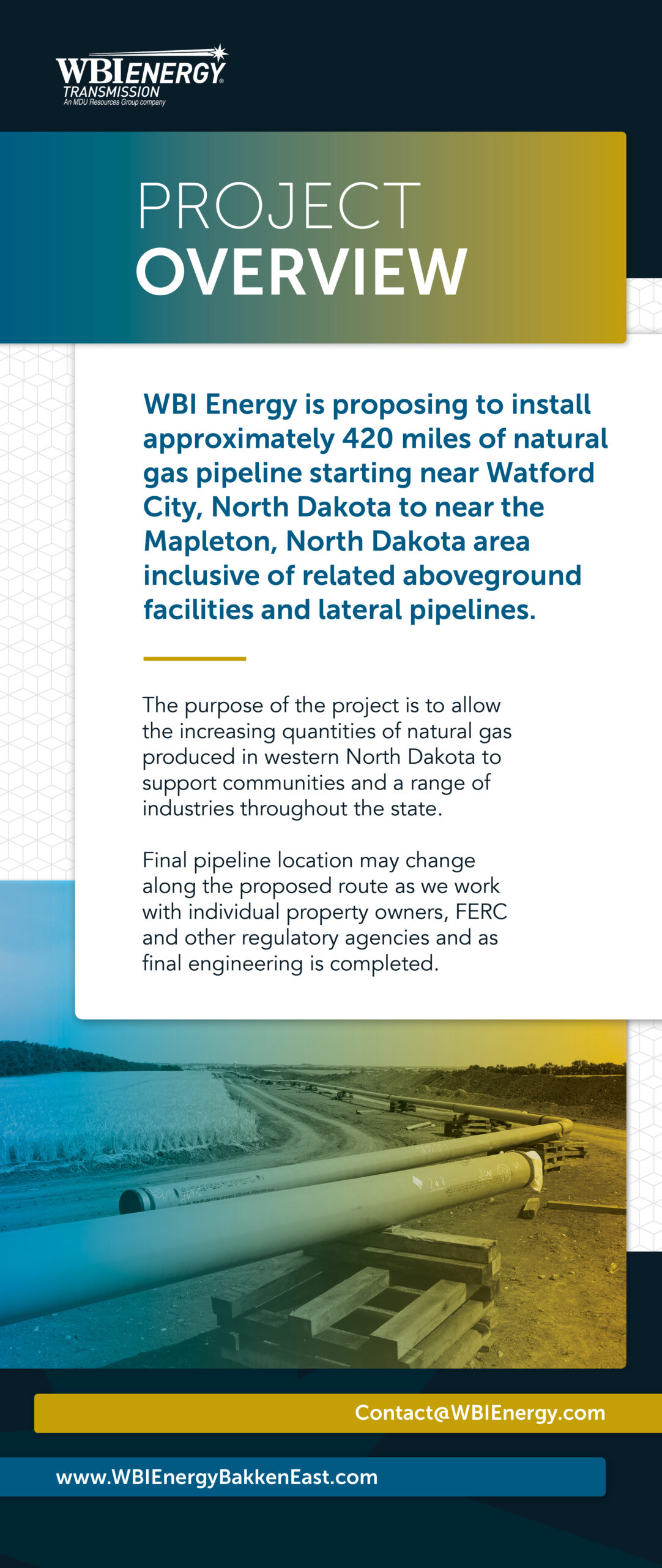 WBI Energy Transmission, Inc. (WBI Energy) is exploring the potential development of the Bakken East Pipeline Project. The project would include approximately 420 miles of natural gas pipeline starting near Watford City, North Dakota to WBI Energy’s existing compressor station near Mapleton, North Dakota inclusive of related aboveground facilities and lateral pipelines, with exact interconnection points still being evaluated.