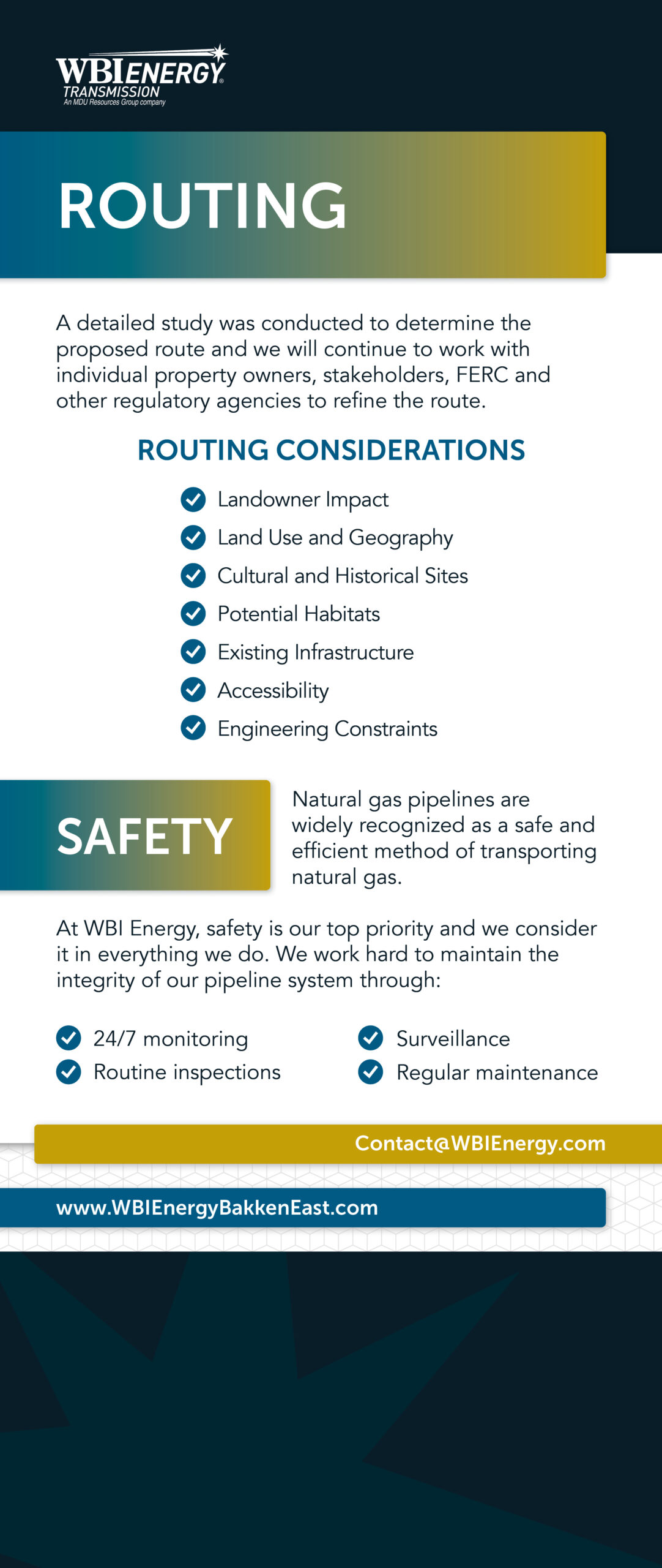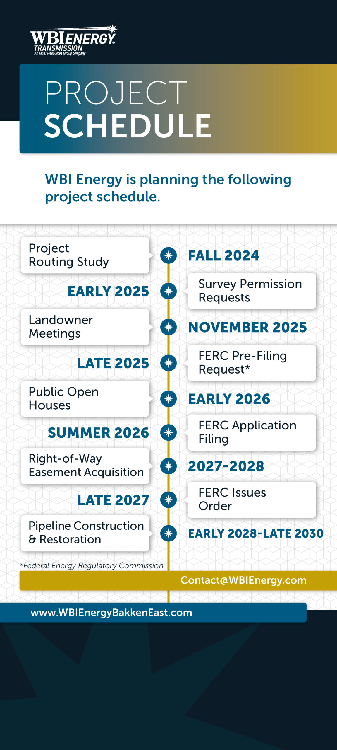 To access information regarding WBI Energy’s filings and any Federal Energy Regulatory Commission (FERC) documents regarding the proposed Bakken East Pipeline Project, visit https://www.ferc.gov/docs-filing/elibrary.asp. WBI Energy’s Pre-filing docket number is PF26-4.